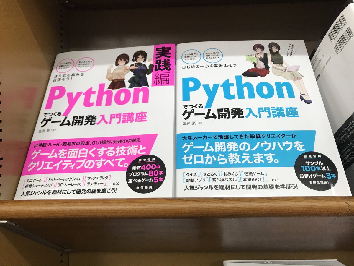 ★丸善 広島店様★ 新刊「Pythonでつくるゲーム開発入門講座実践編」 既刊本「Pythonでつくるゲーム開発入門講座」 2点並べてご展開頂いております! 大手メーカーで活躍してきたクリエイターが教える Pythonゲーム開発入門の決定版です! いつもありがとうございます!
