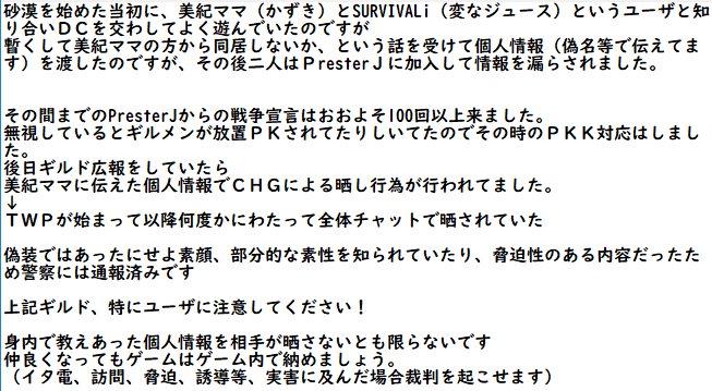PresterJ(ギルド)があまりにもしつこいのでツイートするに至りました 信用して個人情報を与えると自分の様に酷いことになります 都度Pmangに通報はしてましたが対応は一切無く、警察側への提示のみとのことです 周知、注意喚起のため拡散お願いします