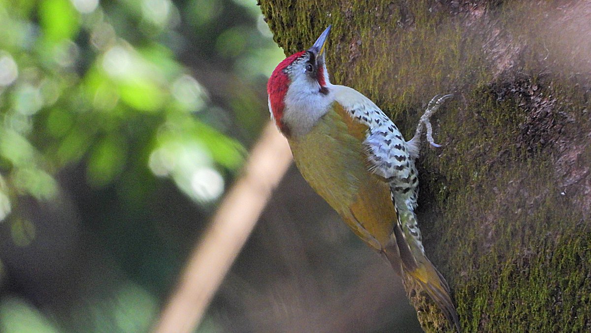 明るい林の中を歩いていると、頭上からコッコッコッと聞き覚えのある音が… いました、コゲラさん