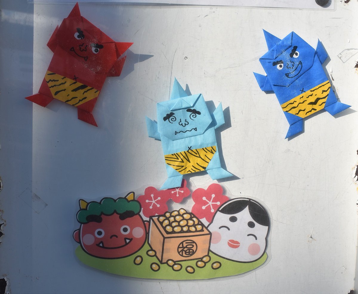 手作りの鬼や豆などが、掲示されている