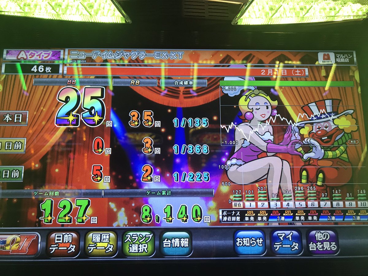 足取り軽く、パチンコ店へ。 アイムジャグ。2月の初めは君で行こう。 なぜか両どなりは女性。 アイムジャグは持てるのか・・・。 アホなことを考えていたら、ペカリ。ビッグ。 何度かペカリ、ガゴッも聞けました。 [収支] -4,000+9,000=5,000 快勝です。