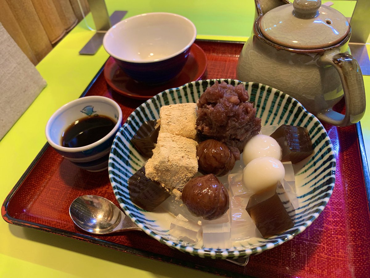 着物は雨降りだったので派手派手にしてみました。あんみつは好物。