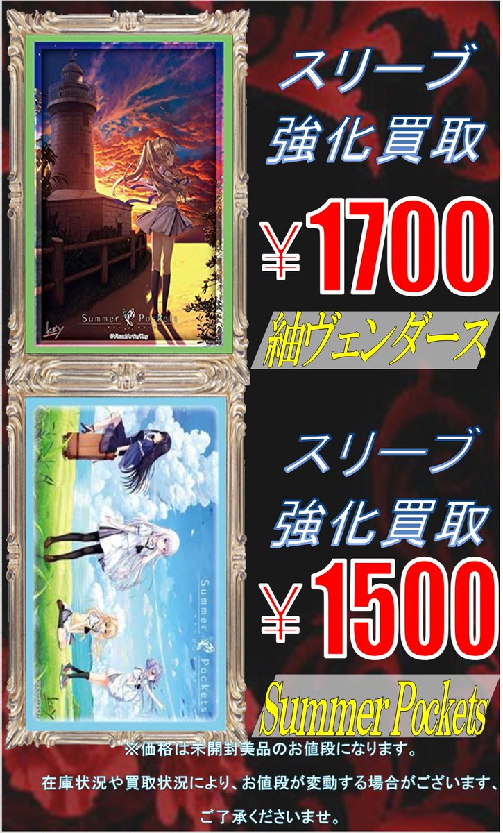 #スリーブ 買取情報】#サマポケ 関連スリーブを強化買取中です 鳴瀬しろは 白枠6000 紫枠4500 空門蒼 白枠4800 紫枠3500 久島鴎 白枠4200 黄枠3000 紬ヴェンタース 問わず1700 Summer Pockets 問わず1500 ※未開封品でのお買取り値段となります、よろしければ是非当店の方までお持ち込みください。pic.twitter.com/w9l4yemuLK