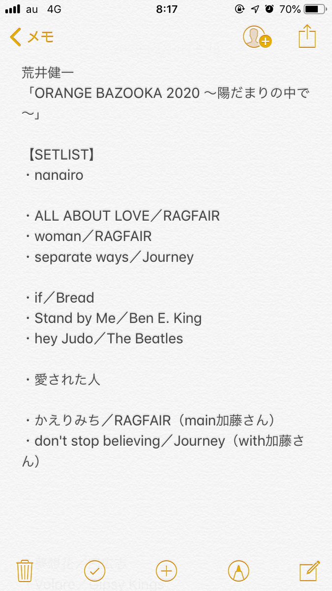 荒井健一 「ORANGE BAZOOKA 2020 ~陽だまりの中で~」SETLIST【修正】 ファンとして恥ずかしき大失態…。 たくさんのいいねをいただいていたので消さずにリプライして修正しました。