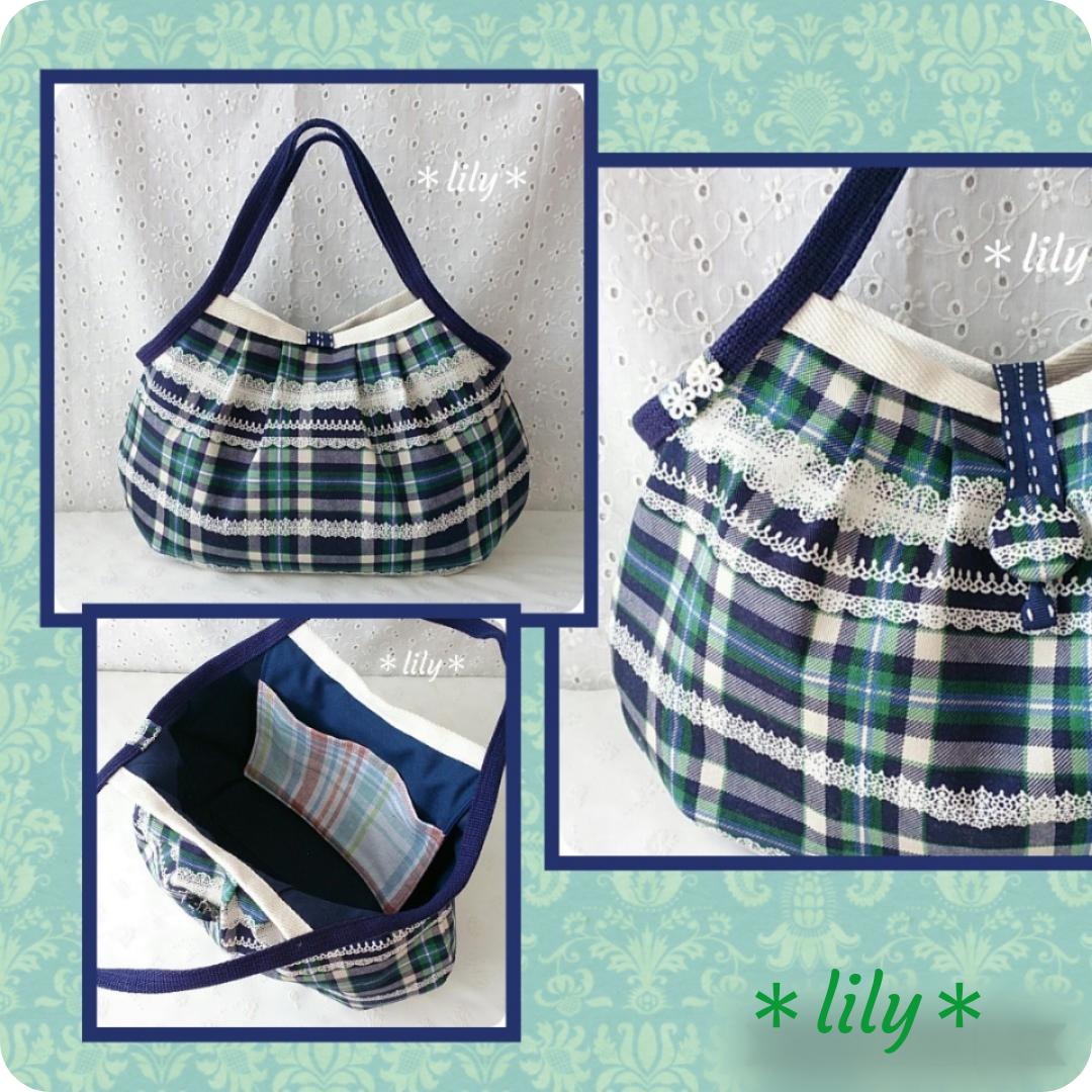ネイビー系のタータンチェック柄にレース柄が描かれた 大人可愛いバッグです