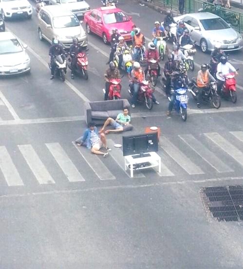 リビングで くつろいでた二人が 突然、不思議な力で 道路の真ん中に 空間転送された図