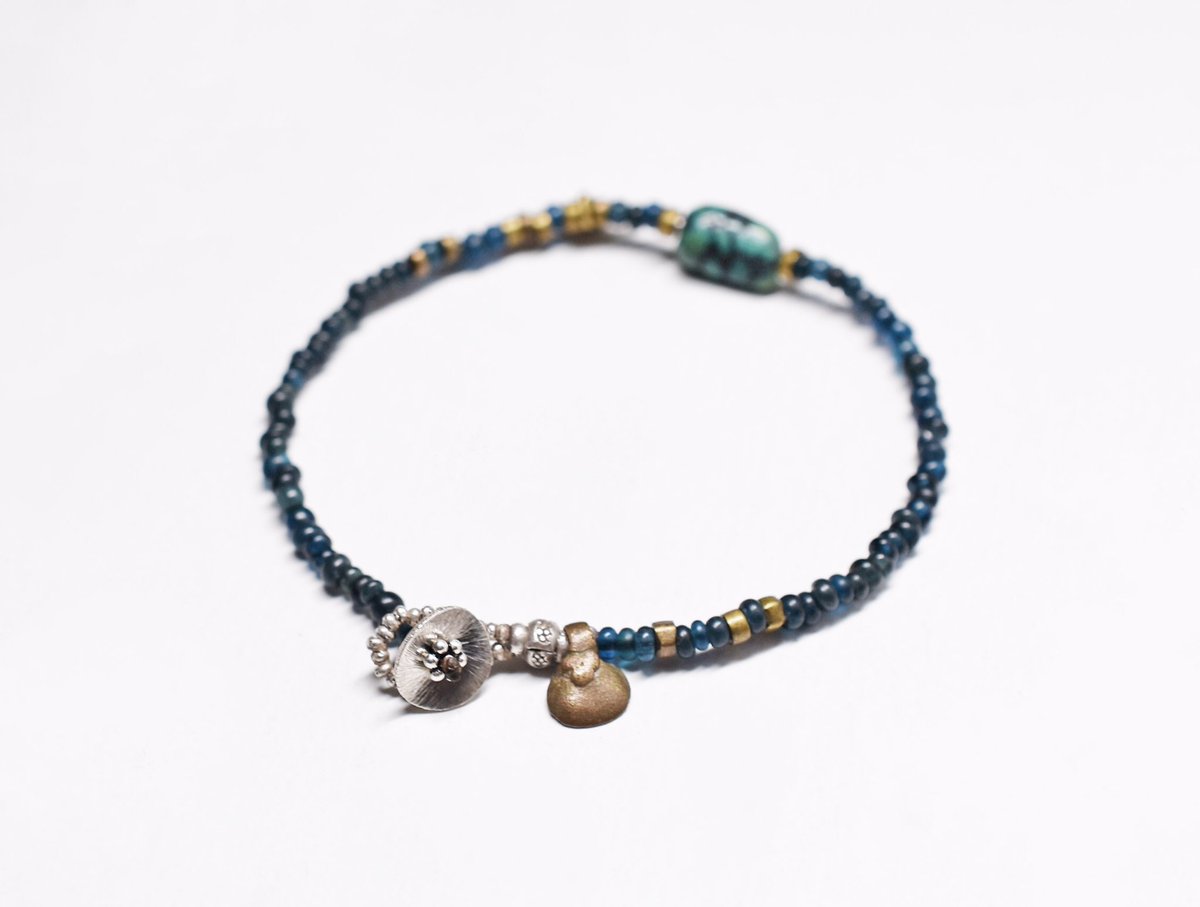 oldチベタンターコイズとインディゴブルーのインドパシフィックビーズ、oldオリッサブラスを繋いだ少し華奢なブレスです。一粒一粒の存在感凄いです!