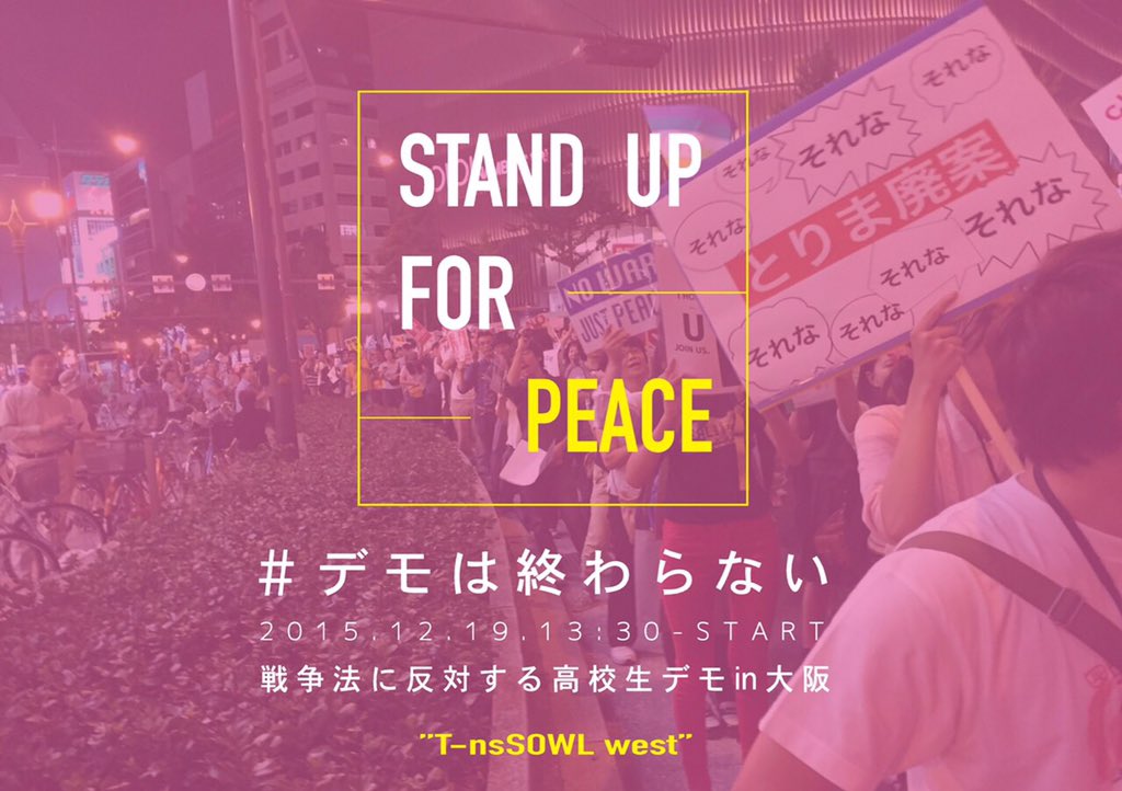#デモは終わらない 戦争法に反対する高校生デモin大阪 2015.12.19.13:30- うつぼ公園集合 14:15出発 Via@tnssowlwestpic.twitter.com/JWj5DxI5ln
