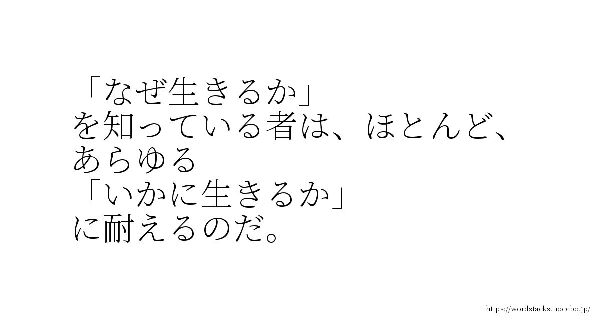 「なぜ生きるか」 を知っている者は、ほとんど、あらゆる 「いかに生きるか」 に耐えるのだ。