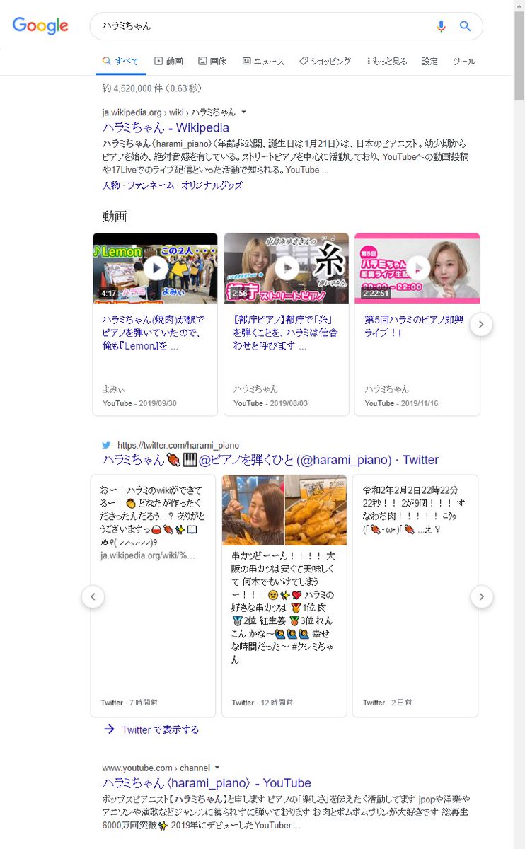 #ハラミちゃん で検索すると、 ・#Wikipedia ・動画 ・ハラミちゃんの最新のツイート ・メインチャンネル と、キレイにまとまって見えるようになりました。 wikiのリンクには人物 · ファンネーム · オリジナルグッズのサブリンクも表示され、見た人が興味を惹かれる検索結果画面になりました。 https://twitter.com/harami_piano/status/1224619744633880576 …pic.twitter.com/Tz1JWHXKPh