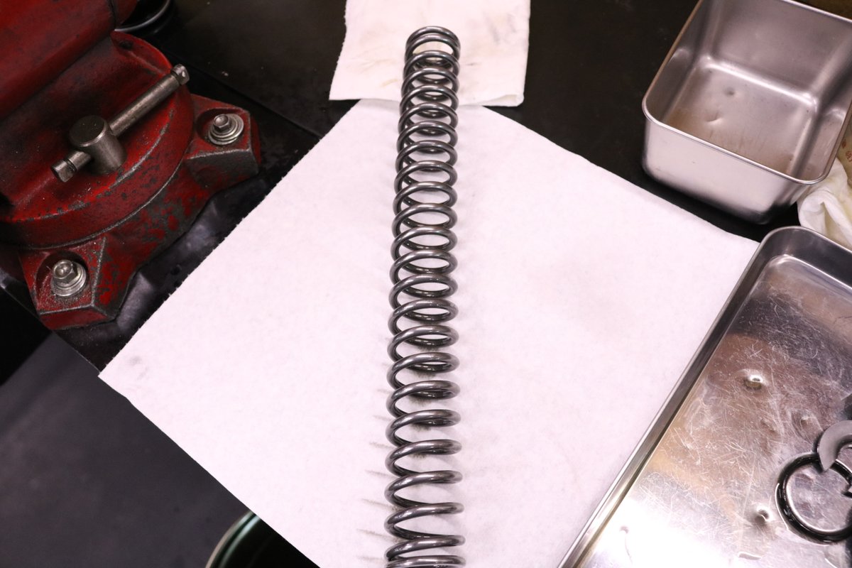 おはようございます。 GSX-R750 RKのフロントフォークをO/H中です。 フォークスプリングは交換されていましたが、材質の問題かも知れませんが、大きく屈折していました。 バネなんて硬さ以外はたいして違いはない。と思うかも知れませんが、結構違いますよ。