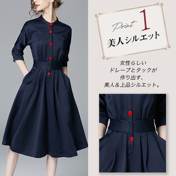 ポップなカラーのボタンがポイントのドレスは、ドレッシーになりすぎないのでパーティーだけでなく、デートなどにもおすすめです