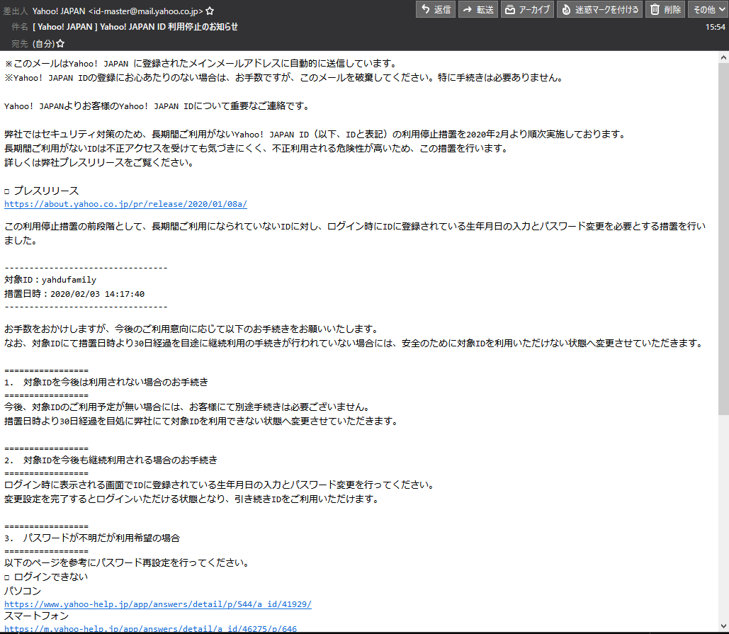Yahoo! Japan IDの利用停止措置に便乗したフィッシングメールが出回っているようです。 文中のIDが自分のものでない等、よく見ればフィッシングメールとわかるのですが、措置が周知されていることもあり引っかかり易いと思ったので、念のためツイート。