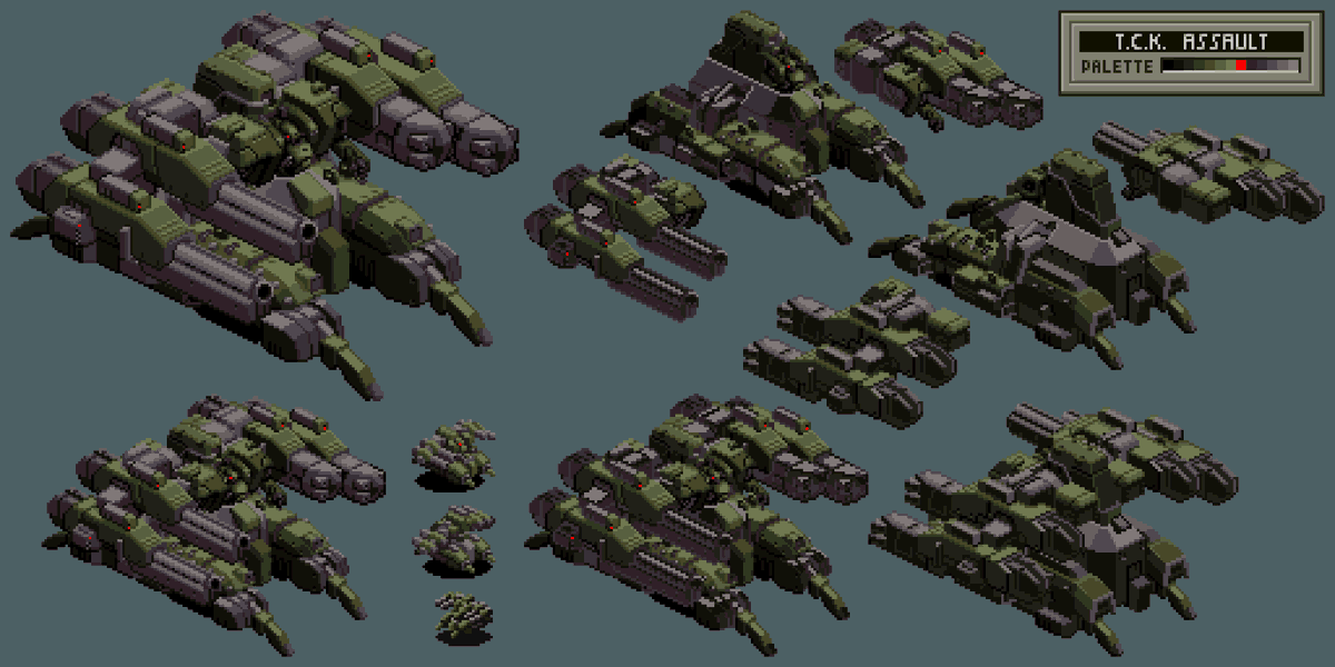 Front Mission 1st - T.C.K. Assault (mobile weapon) setup, shop, battle, stage sprites original + white palettes Armament: Integrated Cannon Integrated Missile Launcher Leg type: Hover