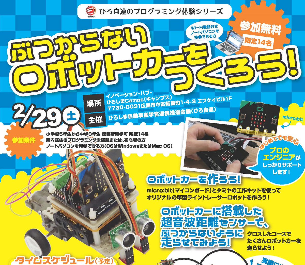 #プログラミング体験 イベント「ぶつからない#ロボットカー をつくろう」開催! 【日時】令和2年2月29日(土)10:00~16:00 【場所】イノベーション・ハブ・ひろしまCamps(広島市) 【定員】14名 【対象】広島県内在住の小学5年~中学3年で、#プログラム未経験 または初心者 https://www.chugoku.meti.go.jp/event/jinzai/200205.html …pic.twitter.com/RIuuOMo5Fm
