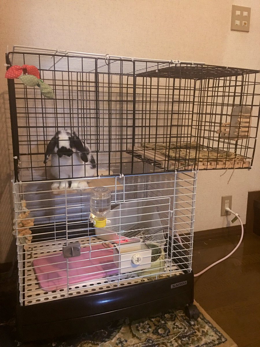 狭そうやったし、ケージを増築してみた。 上で寝たりしてるし気に入ってもらえたんかな? 牧草座布団が特に気に入ったみたいで瞬殺でぼろぼろ