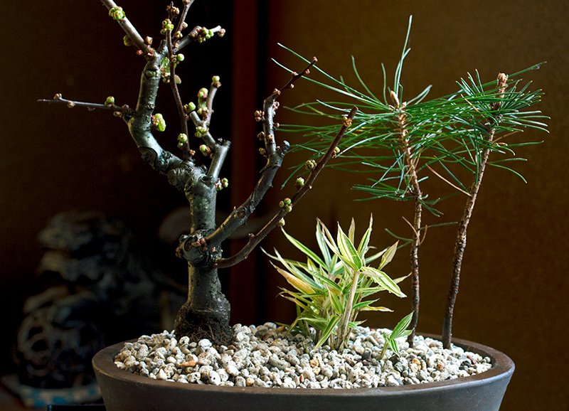 昨年の暮れにお正月用に作ったボケのミニ盆栽に淡いピンクの花が付きました。