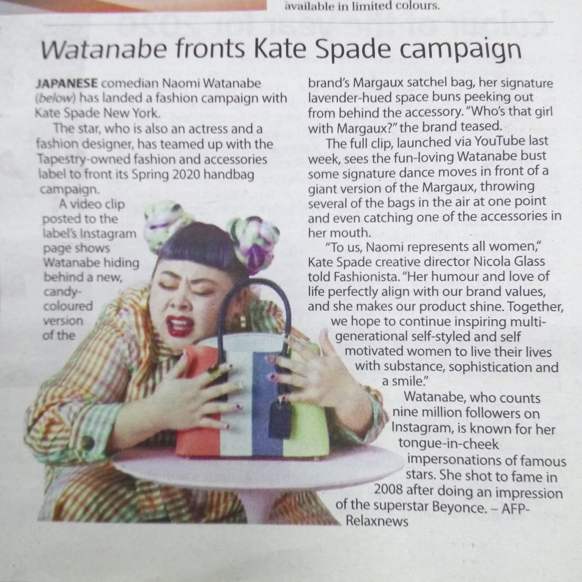 #マレーシア の英字紙 the sun daily に渡辺直美さんがケイト・スペードのアンバサダーになった記事が掲載されていてびっくり。 マレーシア人の同僚曰く、渡辺直美はSK-IIのYoutube広告でみたことがあるから知ってる、とのこと。 pic.twitter.com/Y8iAlM3KeV