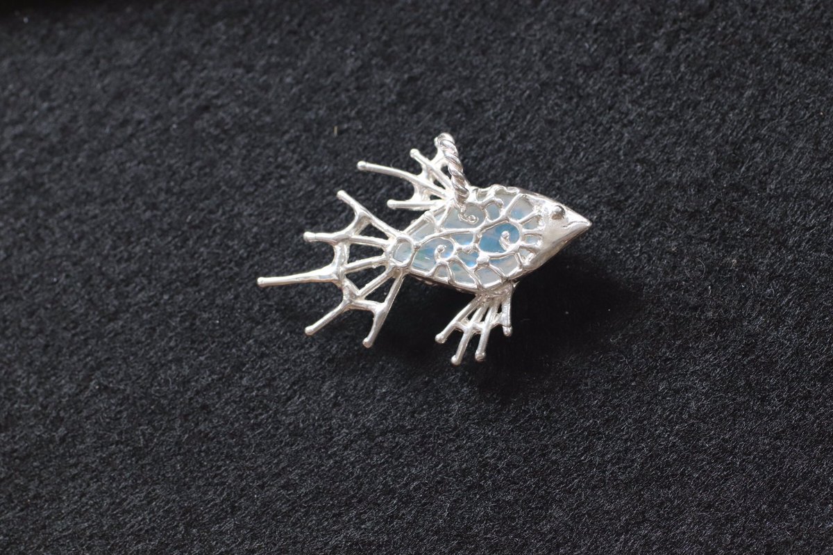 Lenia 新作 Moon fish ブルームーンストーン(ホワイトラブラドライト)にて製作した作品。 裏側は透かし模様にしています。 満月の夜にゆったりと泳ぐ魚をイメージしてみました。 今度の石まつりにてお披露目します。 https://lenia.theshop.jp