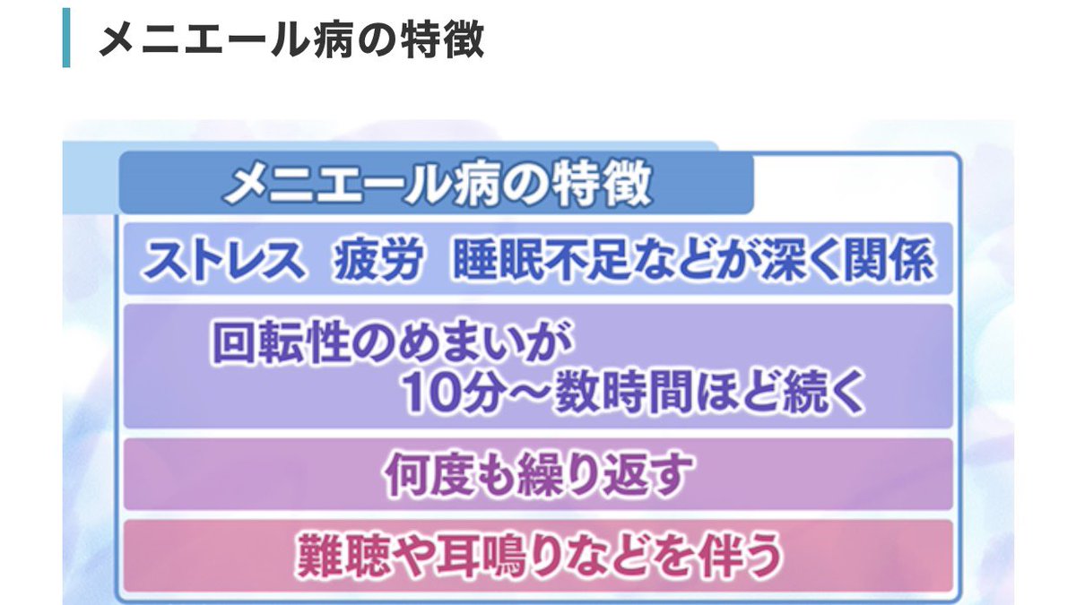 #メニエール病 とは? めまい、吐き気、聞こえにくい、 耳鳴りなどを伴う発作が 繰り返し起こる耳の病気のこと。 身体の平衡感覚をつかさどる 内耳にリンパ液が過剰にたまることが 原因で発症するようです。#病気障がいラヂオ#メニエール病#うつ病 pic.twitter.com/bymZzWMo0s