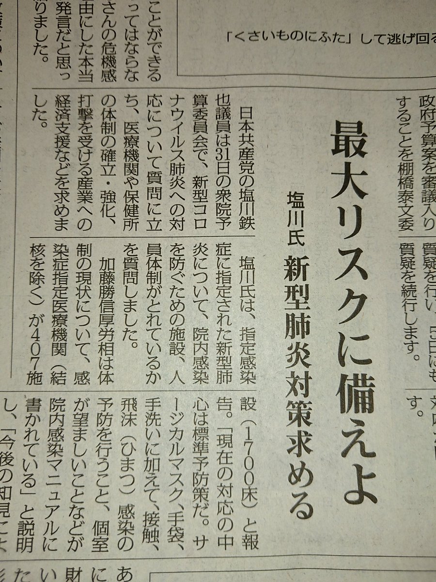 関西弁を話す男性のタレント(?)が、新型コロナウイルスの対策について、野党は他のことをしないでこの問題を取り上げてほしいみたいなことを言ってましたが、一方的に不正確な話を流さないでください。やってるので。(写真は「しんぶん赤旗」2月1日付の紙面)