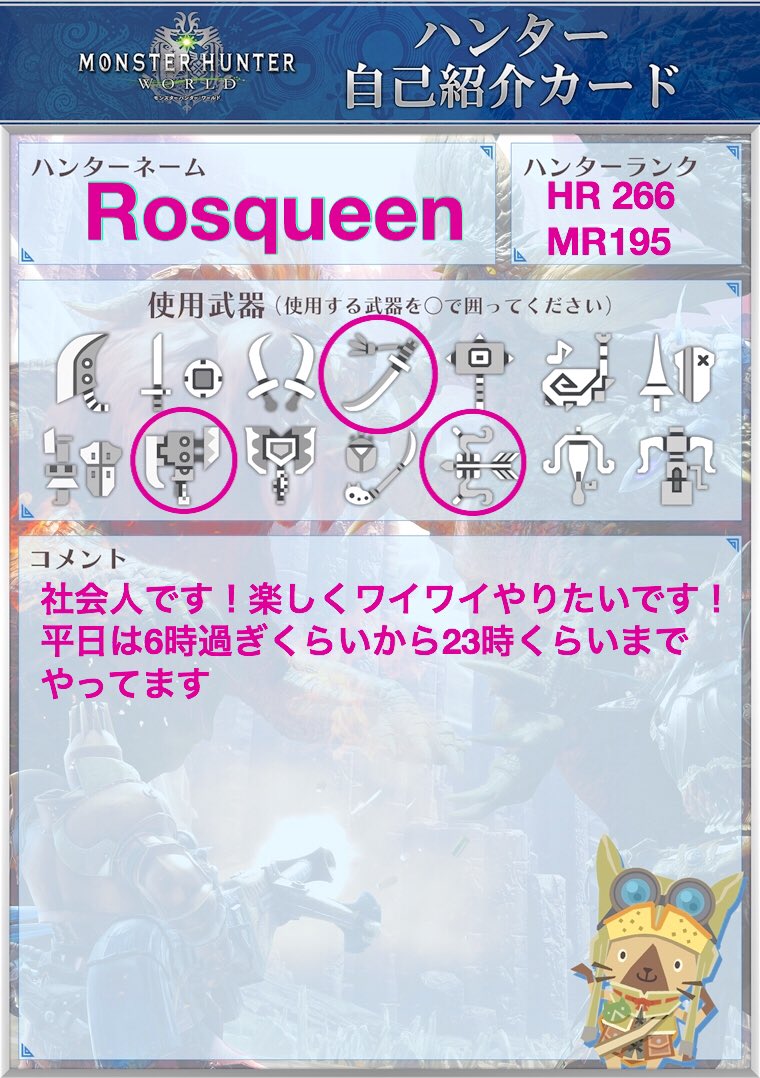 ぼっち狩りさみしいので自己紹介カードつくりました! 狩り友募集中です( ・∇・) よかったら声かけてください!!