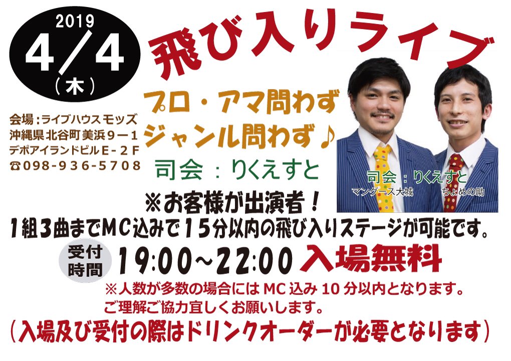 #りくえすと「モッズ飛び入りLIVE」司会】 4/4(木)19:00~22:00 北谷町美浜のライブハウスMODSで行われる 月に一度の「飛び入りライブ」 今月の司会はりくえすと! 1組3曲、プロアマ問わずステージに立てるチャンス! どうぞお越しくださいませ♪#ライブハウスモッズ#飛び入りライブpic.twitter.com/JS5tjgxm8A