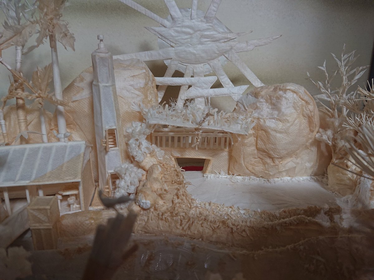 今回紙ナプキンで作った作品は「和風ラッセン」です。 娘がラッセンが好きで、ポスターの絵を見て立体にしてみようと作ってみました。 作品の中に、かたつむり・鳥4羽・亀4匹・かに・へび・とかげ・鳳凰がいますよ。 カフェテラスや部屋にベッド等もあります。
