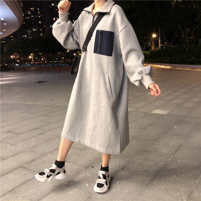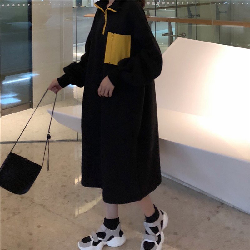 カジュアル配色長袖切り替え膝下丈スタンドネックワンピース