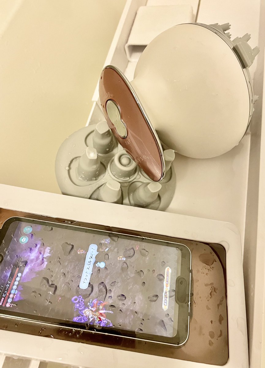 今更ながらバスグッズ購入 バスタブトレーにスマホ防水(IPX6)そしてボーナス前借りでヘッドスパリフト♪ お風呂入りロマサガrs これぞサガ風呂! 今後公式から、武雄・嬉野・古湯温泉の素やタオル、椅子とか出ないかなぁ 湯けむりガチャイラスト付きで