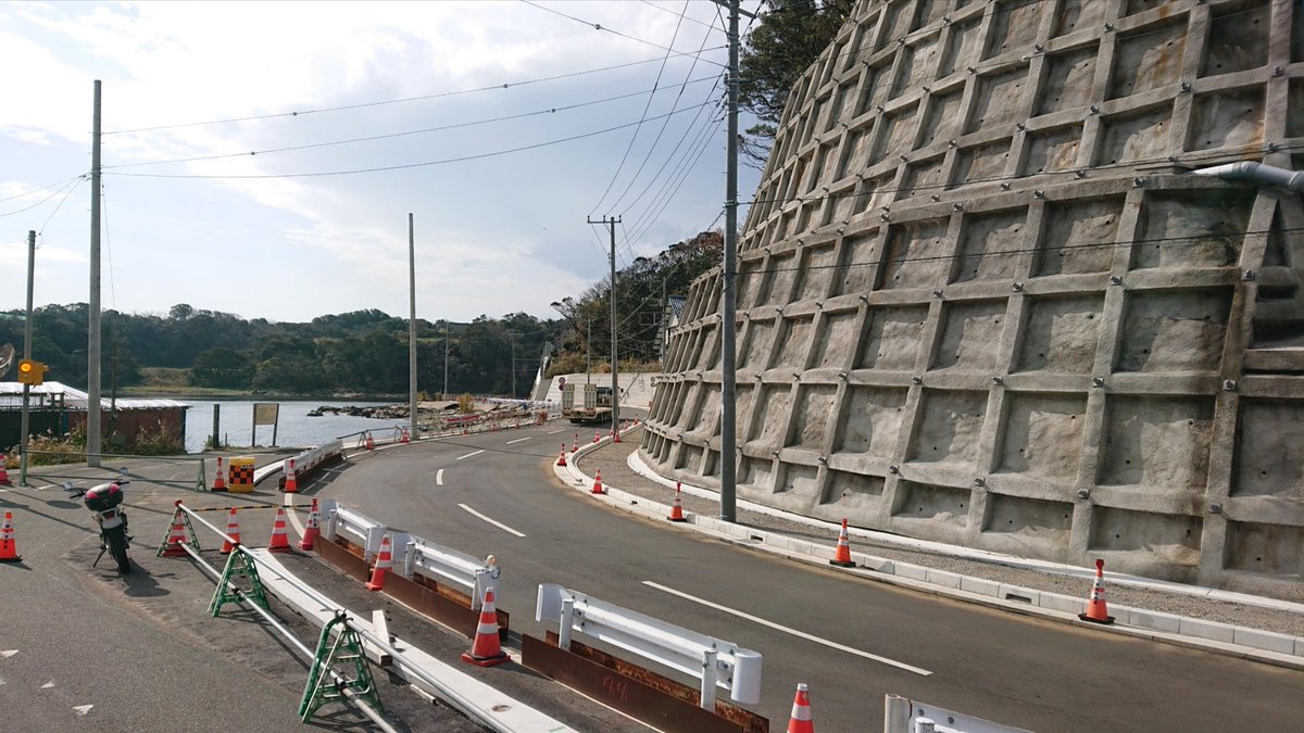 写真1枚目の場所は現在はこんな風になっています。 県道215号の江奈湾付近です。 山側が削られて道が拡幅されました。 以前は狭くてバス等の大型車同士だとすれ違いが困難な箇所でした。 今はこの先の干潟の所にあるバス停も拡幅工事中です。