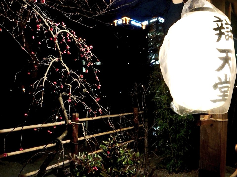 紅梅咲き始め(19:37撮影)。店仕舞はじめた屋台や、ランナーにカップルにホームレスと普段と変わらない雰囲気でした。