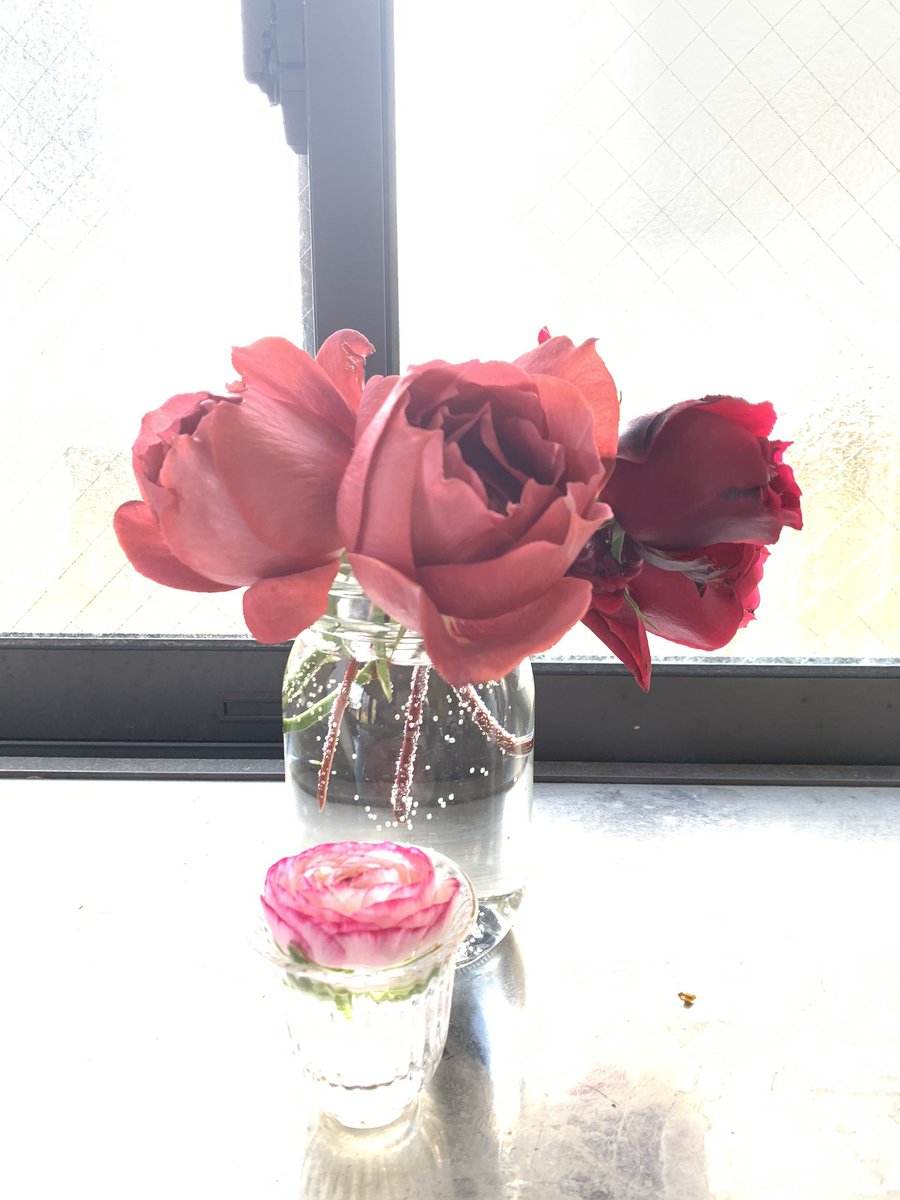 バラの剪定をしてる人からたくさんバラをいただきました。売ってる整然としたのと違い野趣あふれる感じもいいな〜このバラ咲いてる感じとこのDMがかさなります〜DMのお花は芍薬かな?牡丹かな?