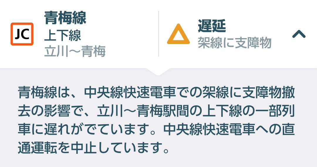 [遅延] JR中央線快速は、新宿〜四ツ谷駅間の架線支障の影響で、100分以上の大幅な遅れが出ています。 青梅線への直通運転を中止。 振替輸送可