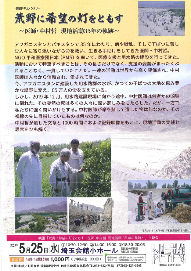 #長編ドキュメンタリー#荒野に希望の灯をともす ~医師・中村哲 現地活動35年の軌跡 ~#アフガニスタン と#パキスタン で35年にわたり、病や戦乱、そして干ばつに苦しむ人々に寄り添いながら命を救い、生きる手助けをしてきた医師・#中村哲。 5月25日(水)埼玉会館小ホール pic.twitter.com/yi7RnoBRv3