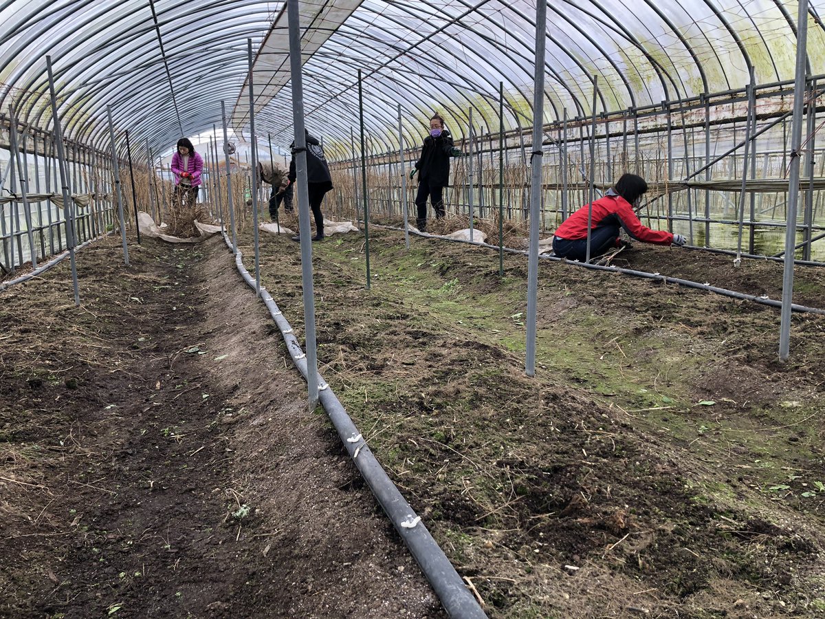 本日の作業は終了です。アスパラガス栽培ハウスの内張りを阿吽の呼吸で。お父さんと、お母さんより 今日の作業で、普段の1週間分の作業して貰って助かりました!!と嬉しい御言葉を頂きました。次回に繋げます。