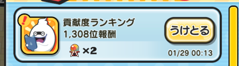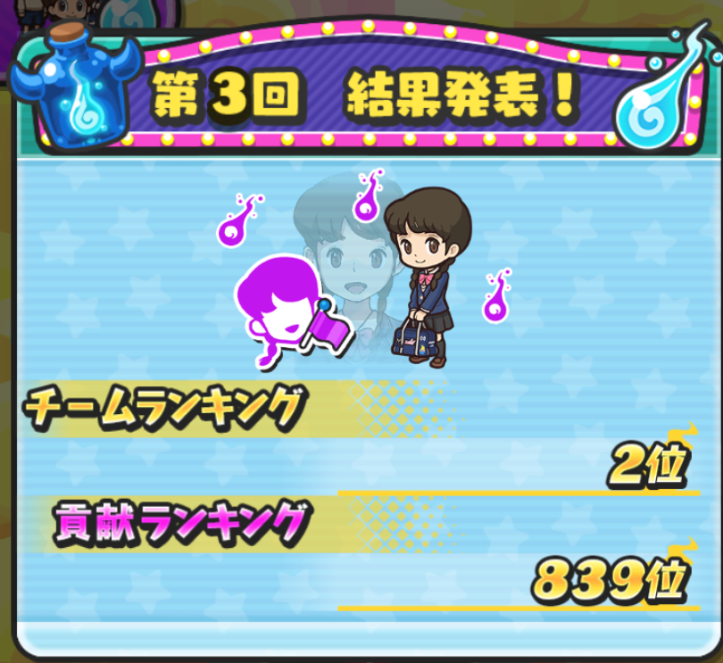 『妖怪ウォッチ++』発売記念!〜魔天・空亡降臨〜 3・4回目の結果 3回目の紫は穴場だったみたいで839位 4回目は1,308位 イベント進むにつれ、寝落ち率が高まってます