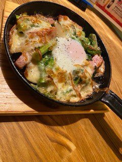今日も元気に営業してます! 写真は『スパムと菜の花、玉子と燻製モッツアレラのオーブン焼き』です