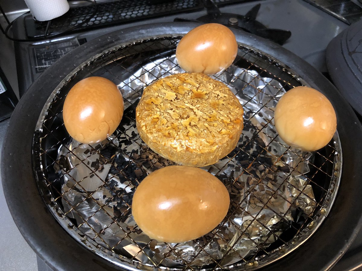 #カマンベール#カマンベールチーズ#燻した#燻製#夜な夜な#仕事後#自分で燻す#卵#玉子 我ながらどこを目指しているのか... 我が家は素敵な燻製臭。まだ水曜なのに...pic.twitter.com/YJPHAvG5ro