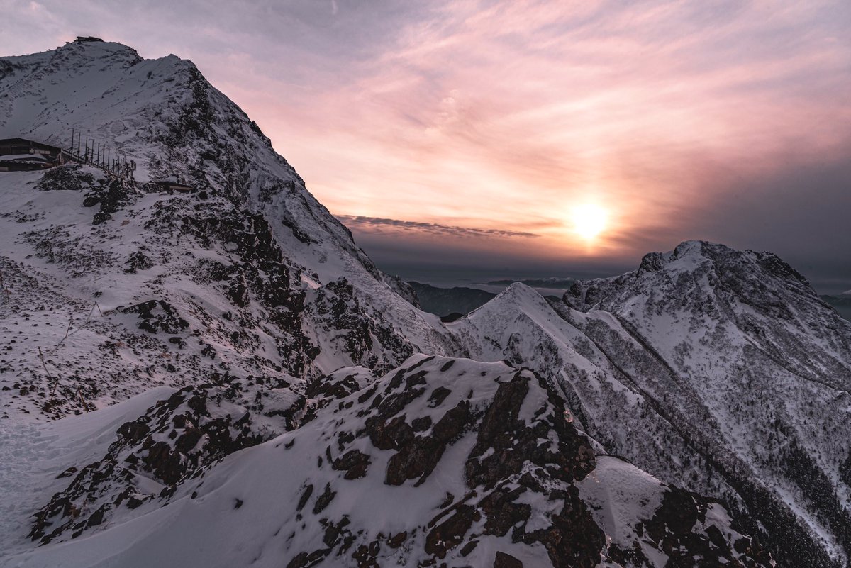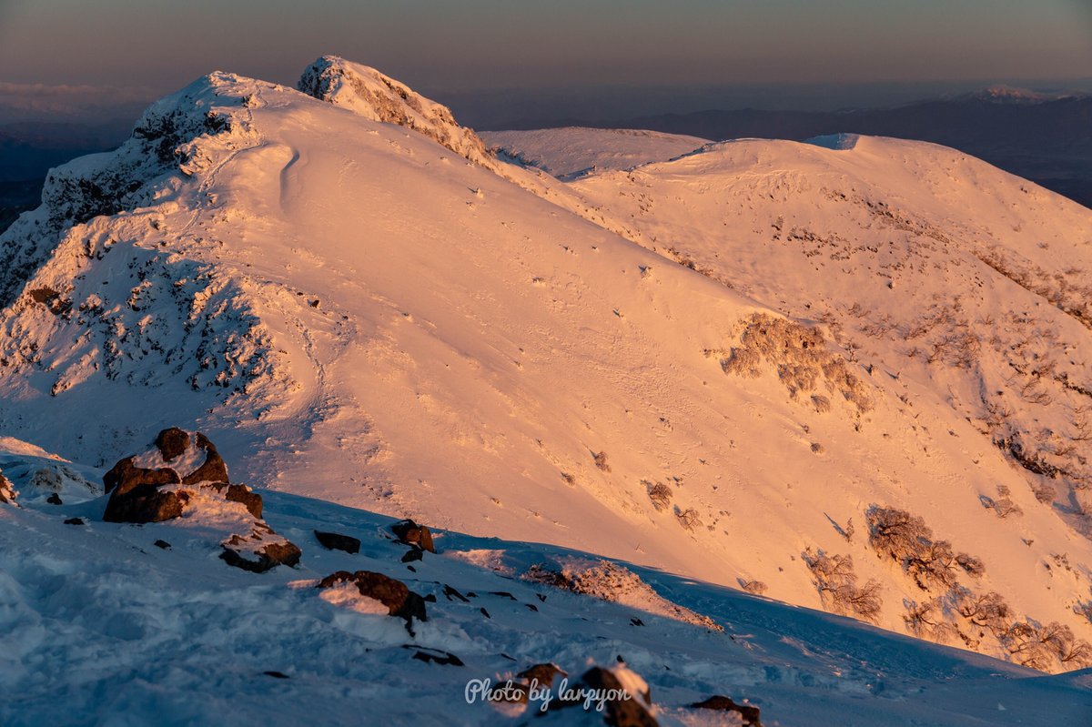 山の上で何度となくご来光や日の入りを見てきたけれど、 その光が目の前の雪を照らすと、その色彩に心奪われてしまった。 2/1夕日と、2/2朝日。