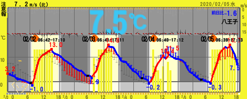 【18:00時点 7.5℃】 14.7~-0.3℃ ★注意報:強風/乾燥 =東京都八王子市