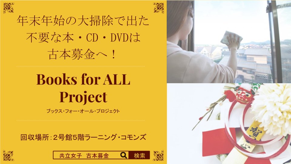 [古本募金-Books for ALL Project] 年末年始の大掃除で出た不要な本・CD・DVDは、古本募金へ! 皆様からの古本募金のご寄付は、本学の学修支援活動に役立てられています。