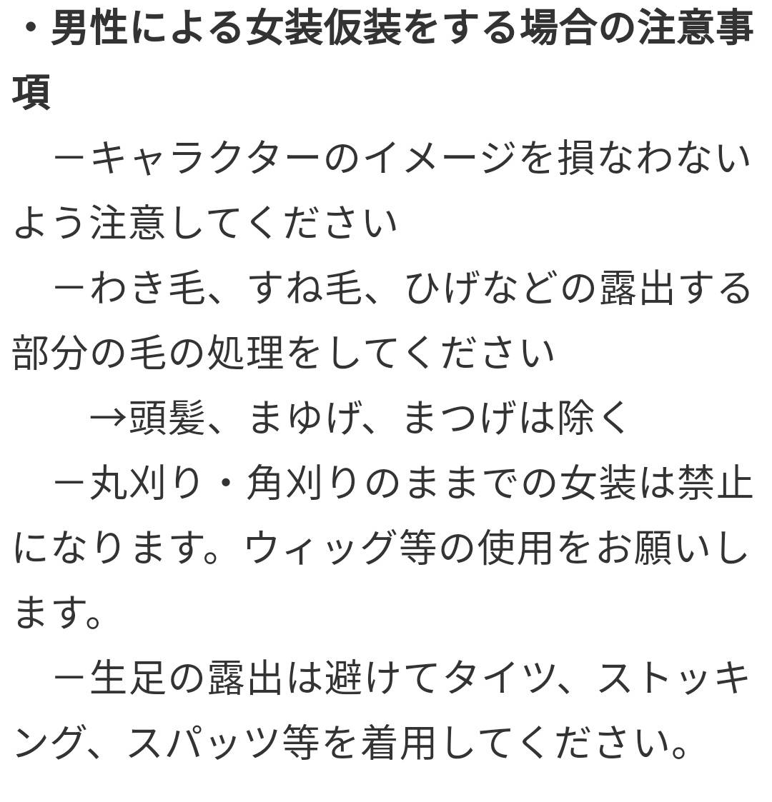 守らない人は、次回男性による女装禁止と及び参加禁止に賛同します。