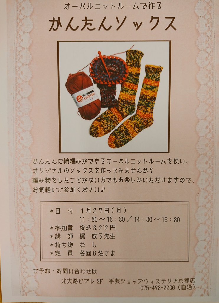 本日1月27日開催クロバー講習会。 京都北大路ビブレ、 手芸ショップウィステリア京都店様で開催です。 オーバルニットルームで靴下を編めますよ