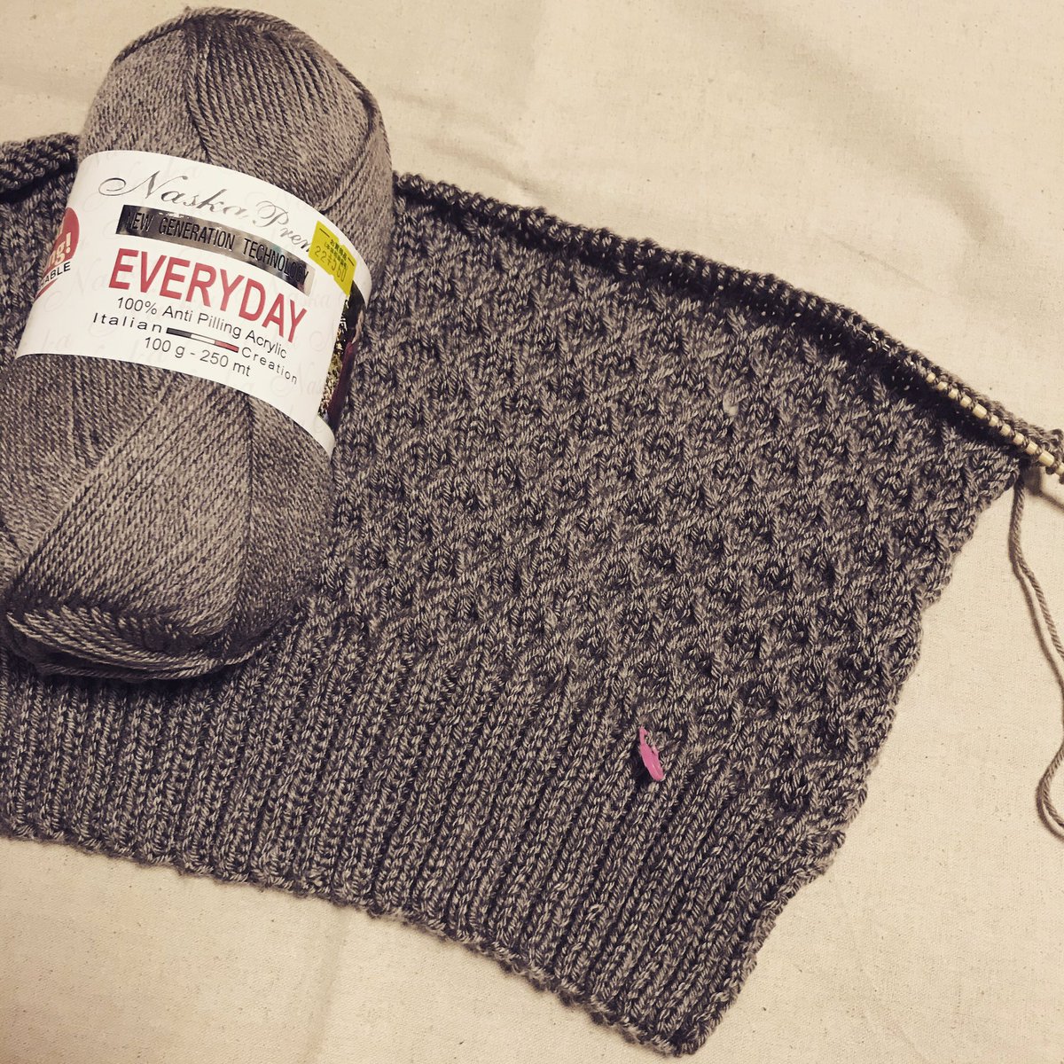 アクリルの糸でセーターを編んでみたくて、EVERYDAYでオリジナルのセーター編んでます。 あまり凝った模様はやだなと、縄編みばりを使わず編める簡単な模様を選びました。 前後身頃に模様を入れて、袖はメリヤスにします。