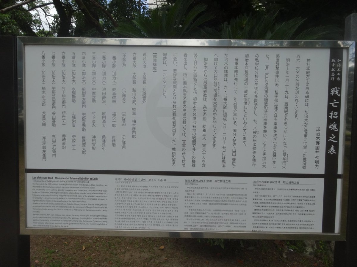 島津義弘終焉の地と同じ敷地内にある西南戦争招魂之碑 加治木から薩軍に従軍した166名の名前が記されている 城山で西郷どんを介錯した別府晋介の名もある 鹿児島県姶良市加治木