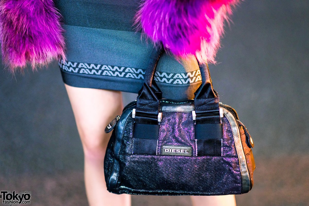 15-year-old Japanese student/model Jaycee on the street in Harajuku wearing a resale cropped faux fur jacket over an Alexander Wang x H&M dress, Forever 21 boots, and a Diesel glitter handbag