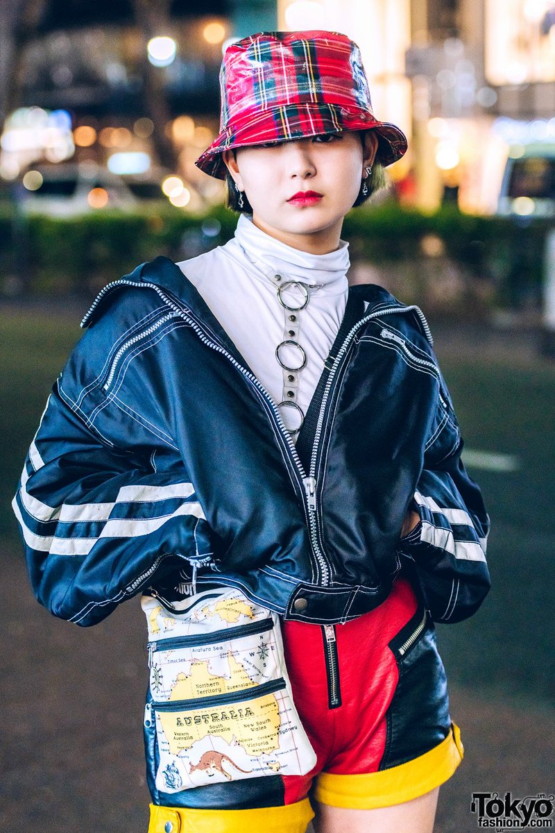19-year-old Japanese student Shion on the street in Harajuku wearing a striped jacket over a turtleneck and harness, shorts from Dolls Kill, a Zara bucket hat, vintage Australia map bag, and Yosuke boots with Adidas logo socks