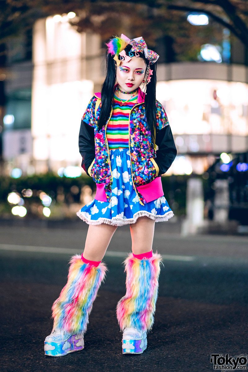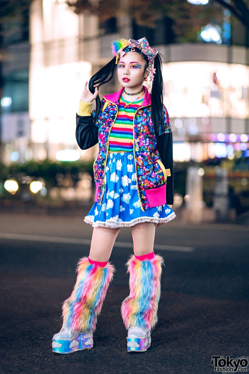 @hahamnmnvr) on the street in Harajuku wearing a 6%DOKIDOKI jacket over a WC Harajuku striped top, a skirt from Kiki2, faux fur leg warmers, YRU cloud platforms, and colorful Claire’s accessories#原宿 http://tokyofashion.com/kawaii-harajuku-style-furry-leg-warmers-6dokidoki-kiki2-yru/ …pic.twitter.com/vmJM6rLRKG