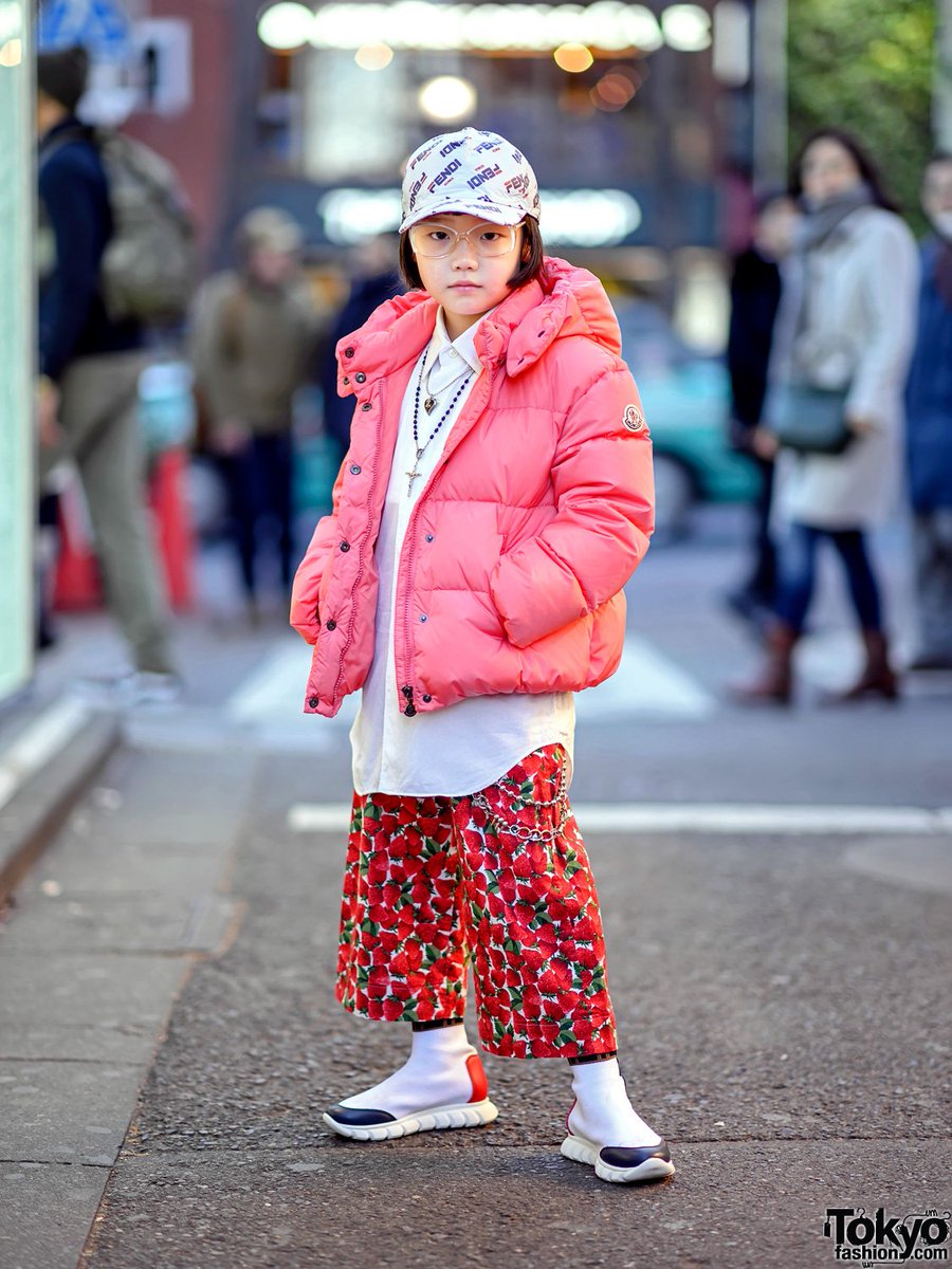 8-year-old Coco Princess on the street in Harajuku wearing a Moncler for Unicef puffer jacket over a Comme Des Garcons shirt, vintage strawberry print pants, Fendi sock shoes, a Fendi cap, and vintage accessories